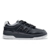 Men’s black leather and suede low-top sneakers with chunky laces and white sole