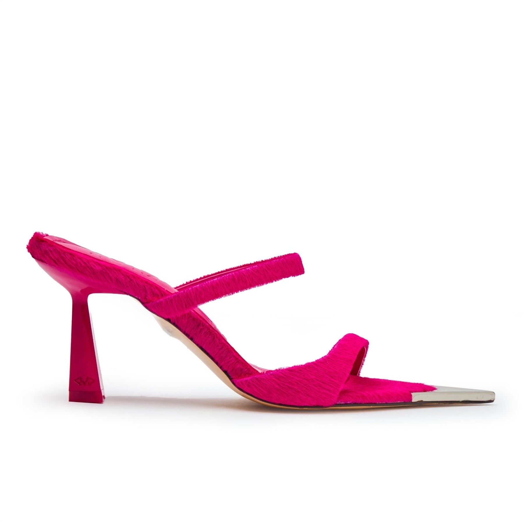 The Frederica Hot Pink Pony Womens heel is a striking point-toe strap design crafted from premium LWG-certified leather. Featuring a silver metal toe cap and a gloss 8cm heel with debossed MALLET emblem, this vibrant stiletto delivers contemporary elegance with a playful twist.