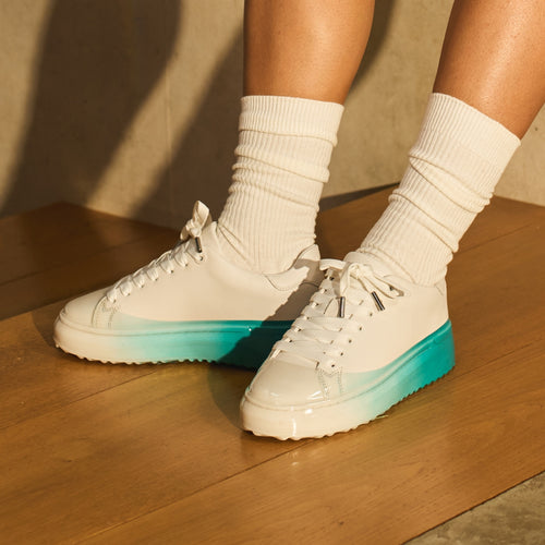 GRFTR Lite Teal Fade Dip Womens delivers a modern low-top trainer with a vibrant, hand-finished sole. Crafted from premium white leather with subtle metallic accents, each teal fade dip sole is unique, creating a luxury casual sneaker for everyday wear.