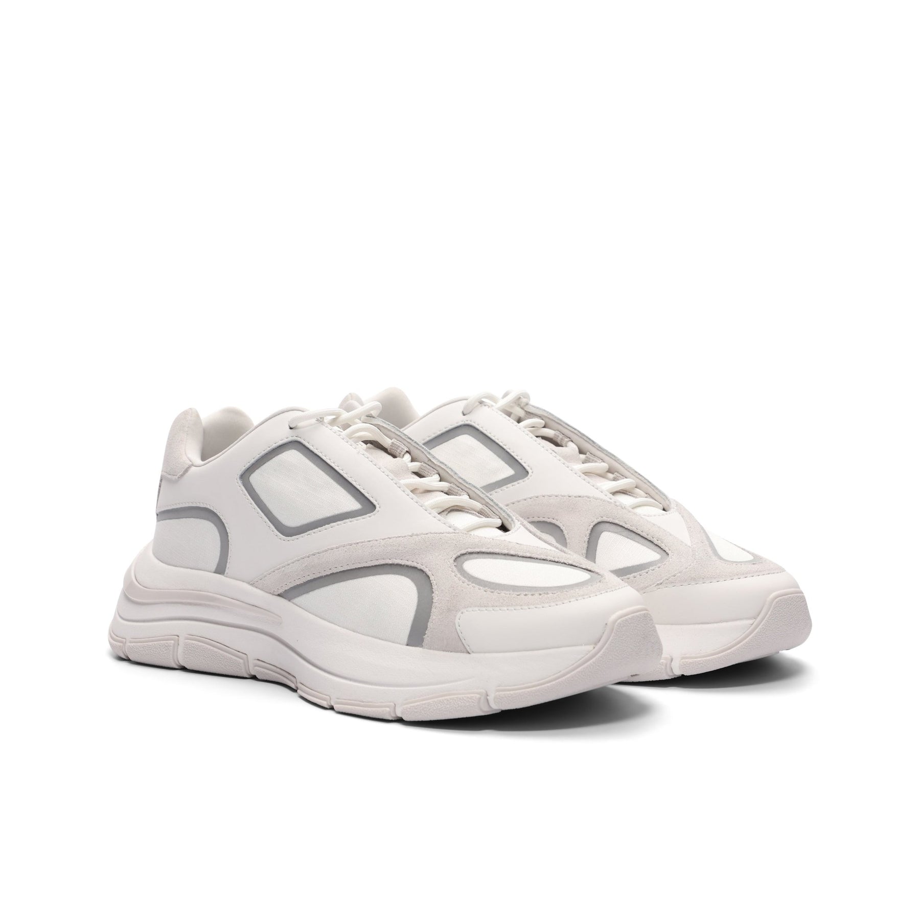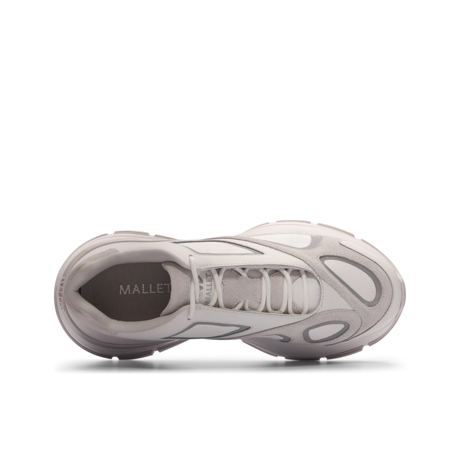 Elevate your streetwear rotation with the Orb White sneakers from Mallet London. Designed in London, England, these asymmetric upper sneakers are inspired by distorted reflections in glass and water, featuring white ripstop underlays, pale grey suede, and white leather overlays for a premium layered effect.