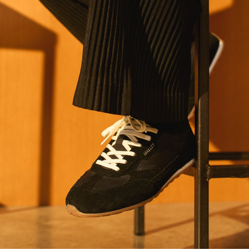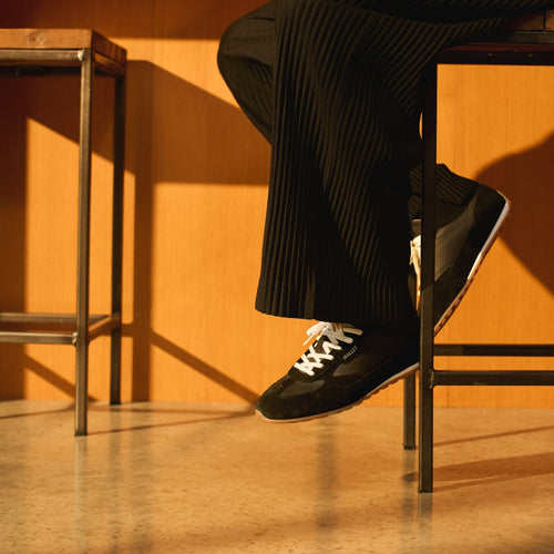 Men's black suede and leather retro runner sneakers with slim gum sole