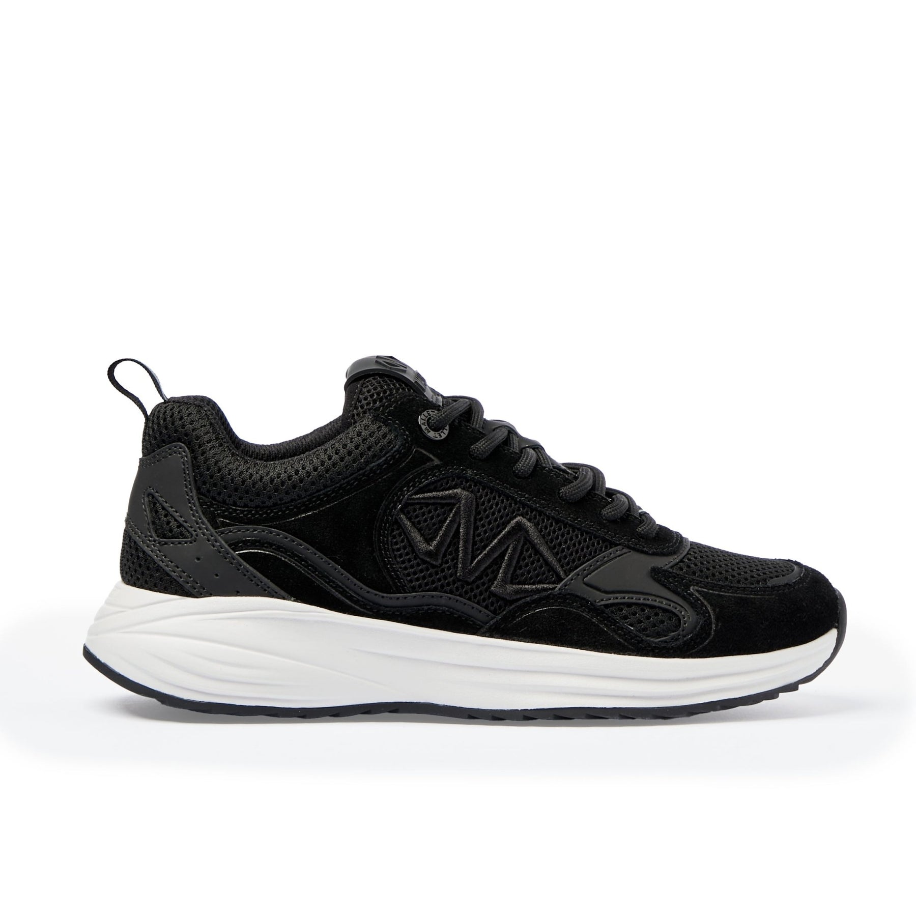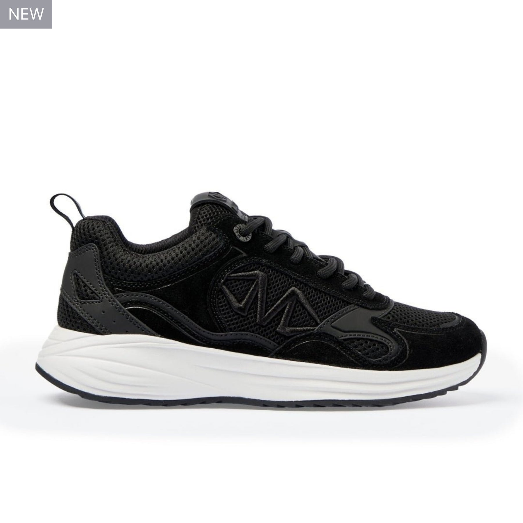 A brand new contemporary sneaker featuring black suede and innovative mesh construction. These premium women's sneakers feature sophisticated mixed materials with bold white outsole contrast for contemporary luxury footwear design.